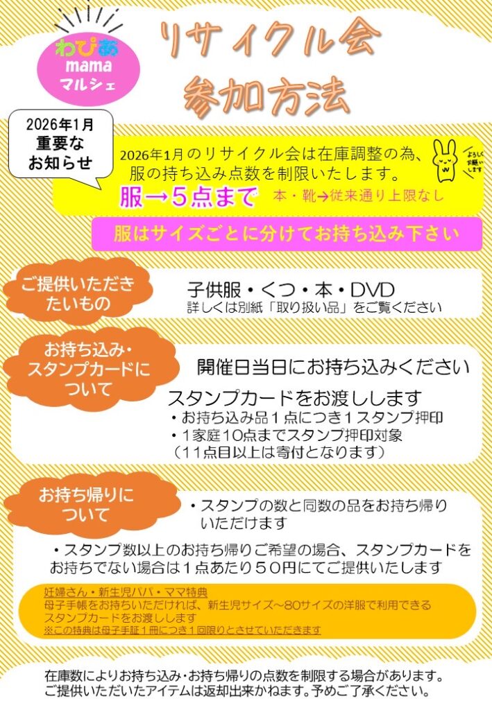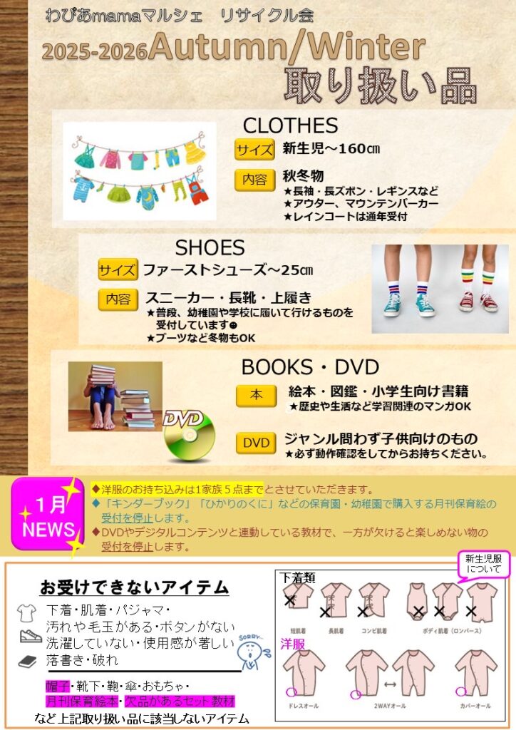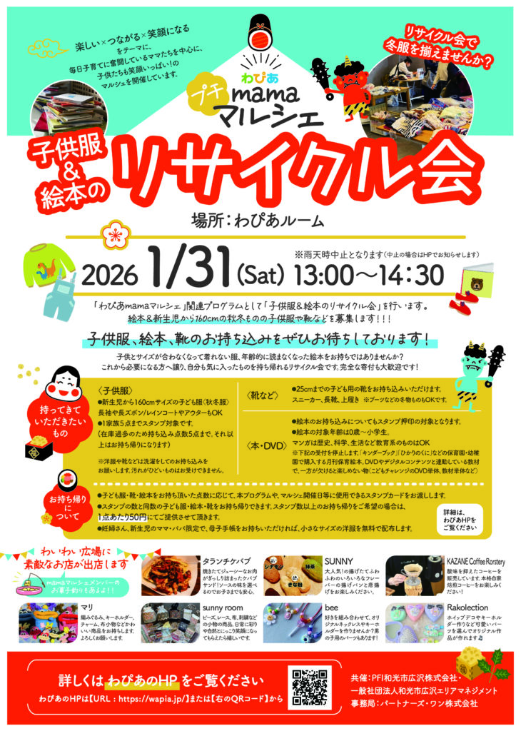 「わぴあmamaマルシェ」関連プログラムとして「子ども服&絵本のリサイクル会」を行います。