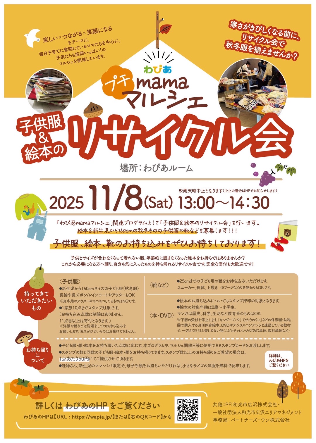 「わぴあmamaマルシェ」関連プログラムとして「子ども服&絵本のリサイクル会」を行います。