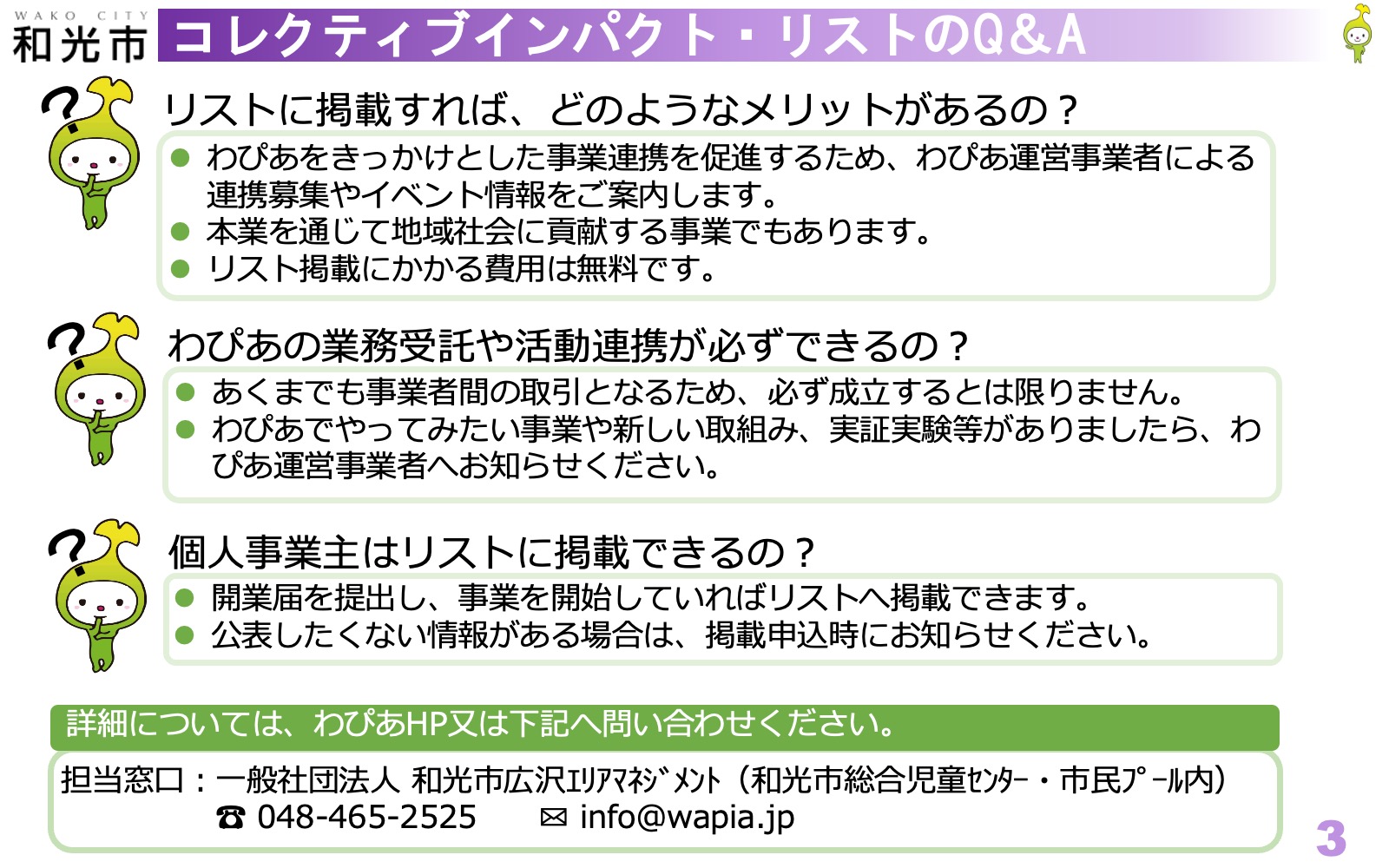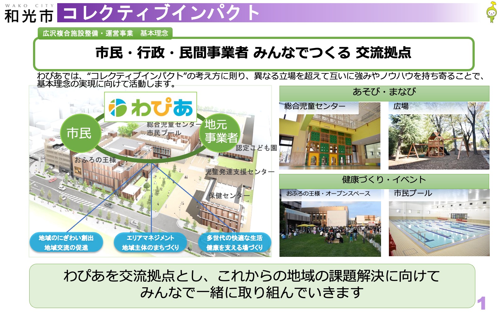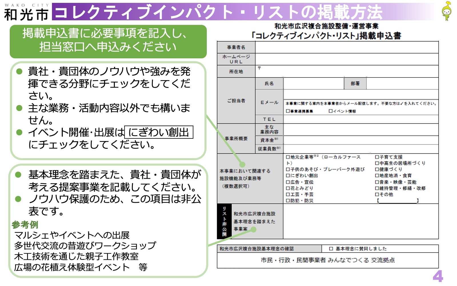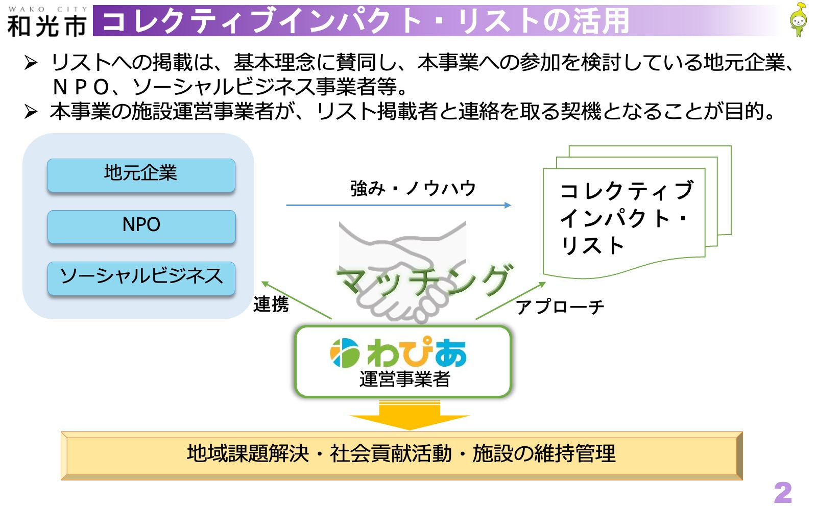 和光市広沢複合施設整備・運営事業は、「市民・行政・民間事業者みんなでつくる交流拠点」を基本理念に掲げています。この基本理念に賛同し、本事業への参加を検討している地元企業・NPO、ソーシャルビジネス事業者等の情報を『コレクティブインパクト・リスト』として公表し、本事業の運営事業者に情報提供するものです。