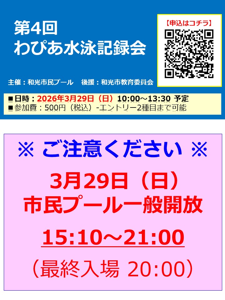 3月29日(日)は「わぴあ水泳記録会」のため、