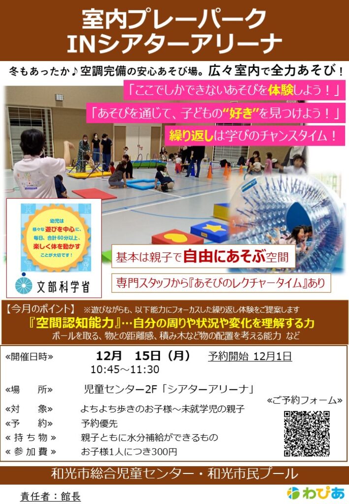 ※対象年齢以外のお子様も参加はできますが、特別プログラムの為、9:45~の「キッズパークdeママリフレッシュ」へのご参加をお勧めいたします。(ご参加される場合のお子様の安全確保は保護者の方にお願いしております。)