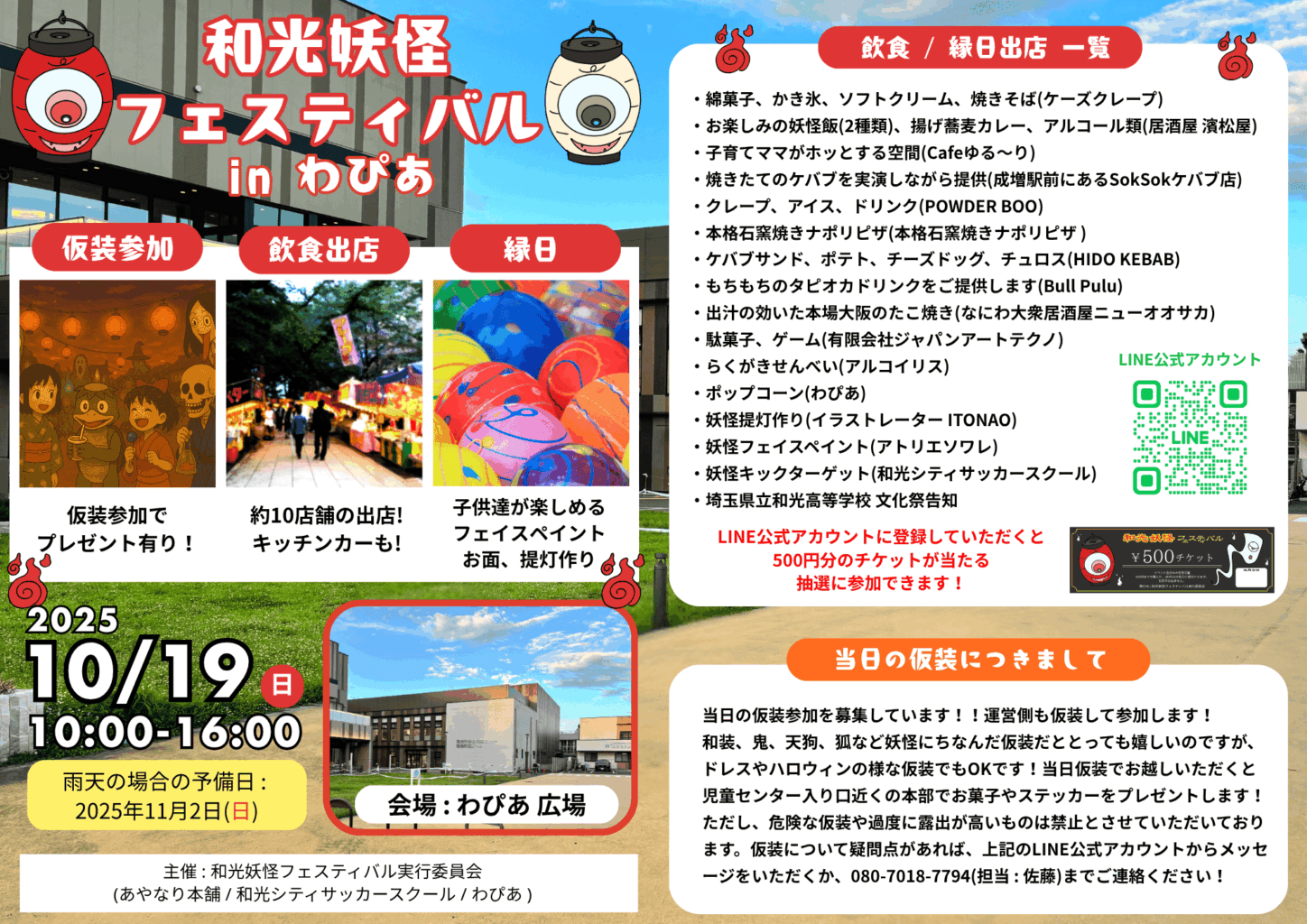 10月19日(日)10:00-16:00にわぴあ広場にて「和光妖怪フェスティバル2025」を開催いたします!キッチンカーを含む10店舗以上の飲食出店に、お面や提灯づくりなどの参加型出店もございます!大人から子供まで楽しめるイベントです!是非ご参加ください!